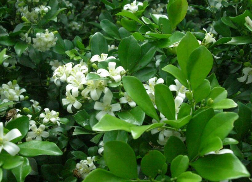 九里香,又叫千里香,葉片小而密集,呈深綠色有光澤。九里香的花潔白素雅,濃香撲鼻。每至秋季,白色小花開滿枝頭,清香襲人,十分幽雅。